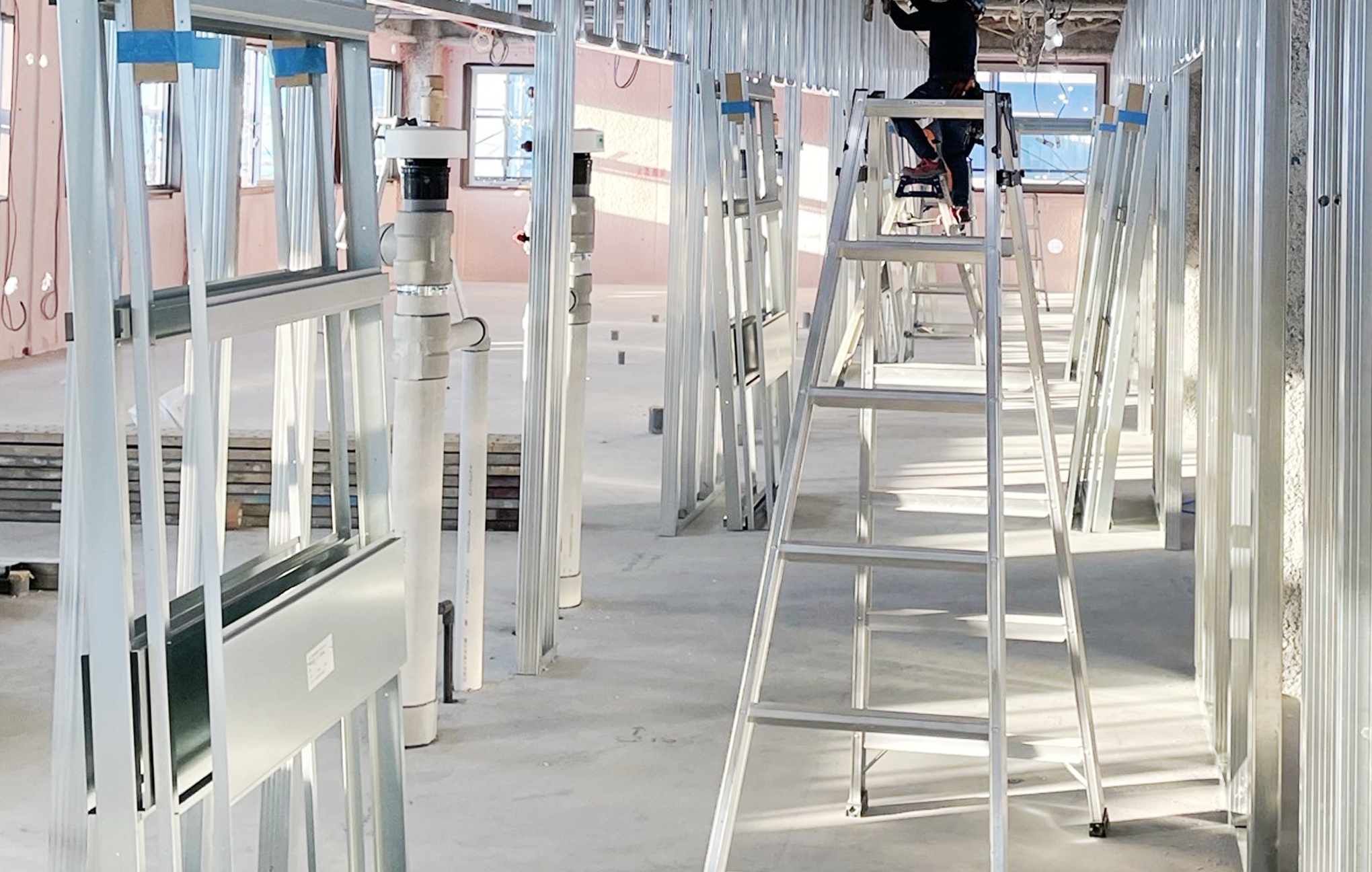 軽い金属(主に鉄)で骨組みをつくり、その上にボードなどを貼って、内装の土台を整えます。木材よりも丈夫で火に強く、商業施設やオフィスビルでよく使われています。